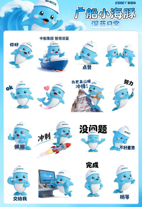 广船小海豚・深蓝日常系列表情包,以灵动可爱的小海豚为核心形象,融入广船“深蓝”底色与造船人的初心情怀,捕捉船厂工作与日常沟通的暖心瞬间。