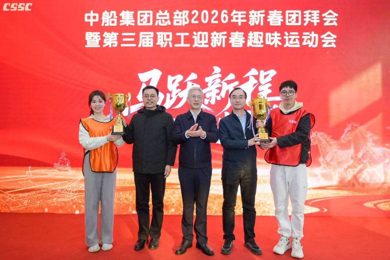 团拜会现场,集团公司领导为运动会获奖队伍代表颁奖。集团总部各部门和二级管理单位通过视频集体“云拜年”,感受属于中船人的龙马精神与团圆暖意,充分展现了中船人在“十五五”开局之年,一马当先开新局、矢志奋进建新功的昂扬风貌,凝聚起高质量建设世界一流船舶集团的磅礴力量。