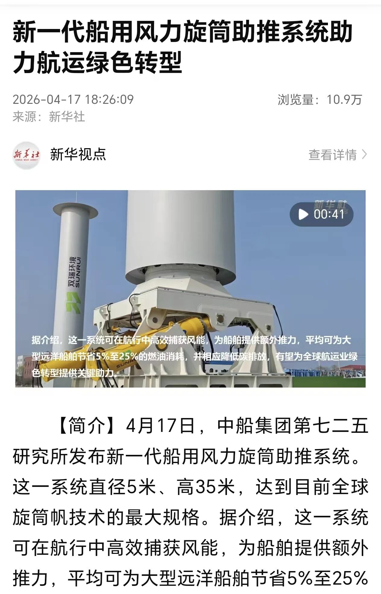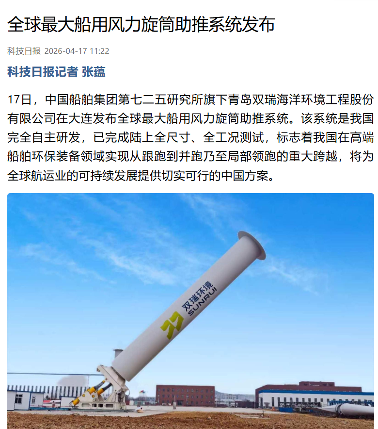4月17日,中国船舶集团有限公司七二五所旗下双瑞环境正式发布全球最大船用风力旋筒助推系统。 央视、人民日报、新华社、科技日报、半岛晨报等多家中央及地方媒体第一时间关注报道。