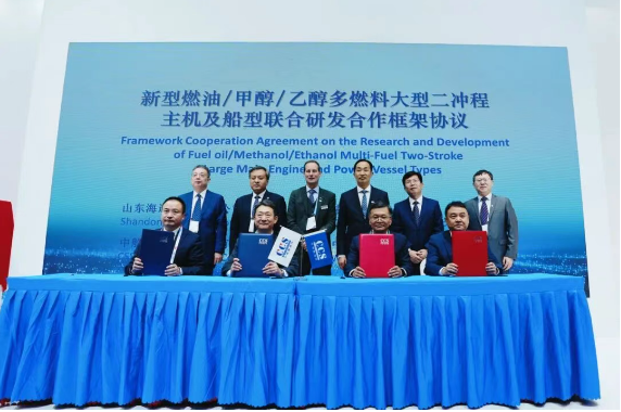 同时,山东海运股份有限公司、中国船级社、中船动力(集团)有限公司、WinGD四家单位联合签署《新型燃油/甲醇/乙醇多燃料大型二冲程主机及船型研发联合开发合作协议》。助力我国“双碳”目标与可持续发展战略落地,为“海洋强国”、“交通强国”建设筑牢技术与产业根基,助力支持全球海事的可持续发展。