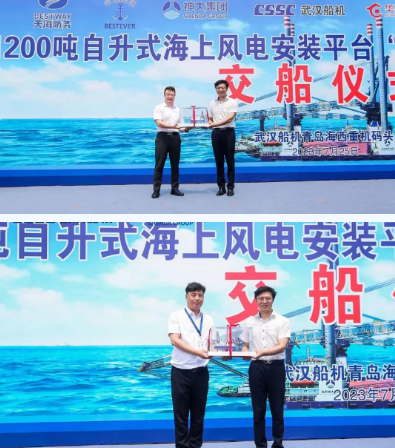武汉船机党委书记、董事长马聚勇,北京神大集团有限公司总经理张晓飞,飞励特船舶管理有限公司副总裁马利,华夏金融租赁有限公司总裁沈宗庆先后在交船仪式上发表讲话。随着国家实现“碳达峰、碳中和”目标指引,清洁能源迅速发展,我国海上风电投入布局和建设加快。为获取更多的海上风能资源,海上风电正向深远海风电场拓展,华夏金租神大01号1200吨自升式风电安装平台因此而生,是开发深远海风电资源的又一利器。该平台的顺利交付,不止是武汉船机依托技术创新、装备优势、努力拼搏的成就,更是船东、船东代表、监理、分包方共同努力耕耘海上风电市场结出的又一硕果。”