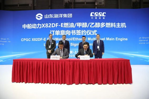 开展首日,中船动力与山东海运举行X82DF-E燃油/甲醇/乙醇多燃料主机订单意向书签约仪式。山东海洋集团有限公司党委书记、董事长姜国栋,中国船舶集团有限公司党组成员、副总经理彭原璞出席了仪式,山东海运、中船动力相关领导共同参加本次签约仪式。山东海洋集团副总经理、山东海运党委书记、董事长高长峰与中船动力总经理、党委副书记邵煜代表双方签署了多燃料主机订单意向书。