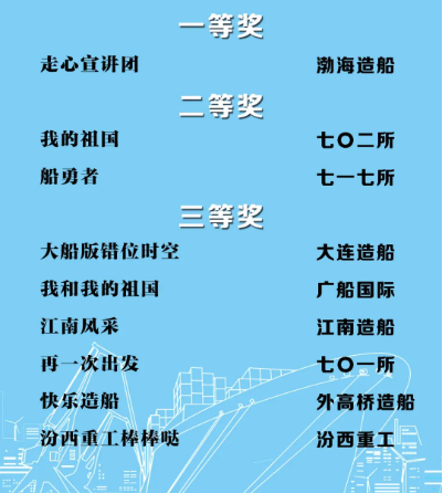 由中国船舶集团党群工作部指导,中国船舶集团新闻宣传中心/中国船舶报社承办的中国船舶集团第二届短视频大赛圆满落幕。经过前期筛选,网络投票,并特邀国务院国资委新闻中心、国防科工局新闻宣传中心、中央电视台、微博政务、中国船舶集团党群工作部专家评审,大赛最终评出一等奖5部,二等奖10部,三等奖23部,同时评出优秀组织奖单位6家。名单如下,快来围观!