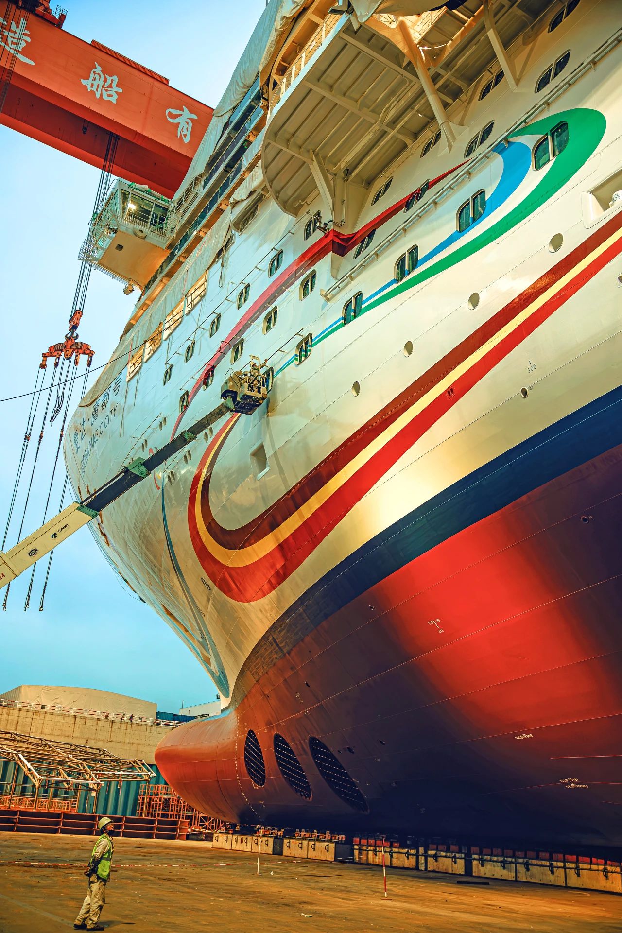 照片摄于国产首艘大型邮轮首次出坞前夕,拍摄时期为傍晚,船坞开启灯光照明,工人在对船身做最后的涂装修饰工作。这样的角度观看国产首艘大型邮轮令人无比震撼。