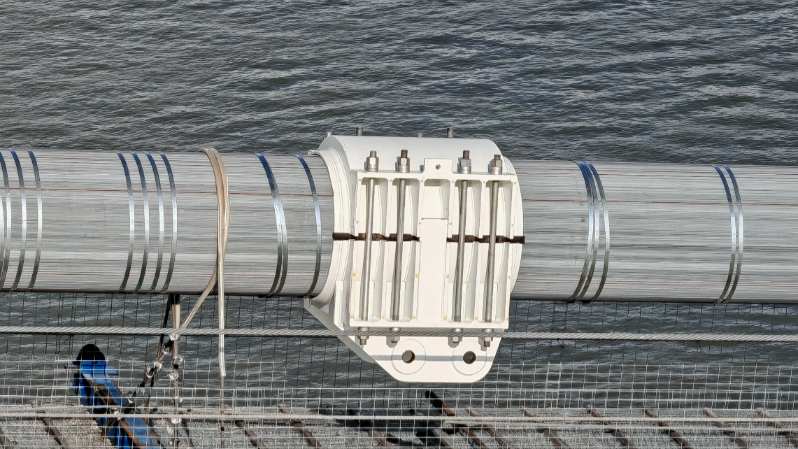 燕矶长江大桥横跨湖北鄂州和黄冈两地,采用一跨过江方式,大桥主跨1860米,是世界最大跨径的四主缆悬索桥。因上受鄂州花湖机场航空限高影响,下要满足长江通航需要,大桥主塔高度仅184米,垂跨比达到千米级悬索桥中前所未有的1:15。为解决这一难题,大桥采用了世界首创不同垂度四主缆双层悬索桥结构体系,首次在大跨度悬索桥中采用双主缆并列式主索鞍设计及全焊式索夹结构。公司承制了8套主索鞍,308套全焊接索夹,16套缆套,288套防护罩。