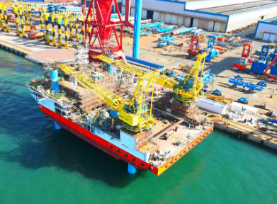 近日,中国动力子公司中船武汉船机自主设计建造的JANA 510海上自升式作业支持平台在青岛海西重机码头完成下水站桩的关键建造节点,这标志着该平台的主体结构已全部完工。